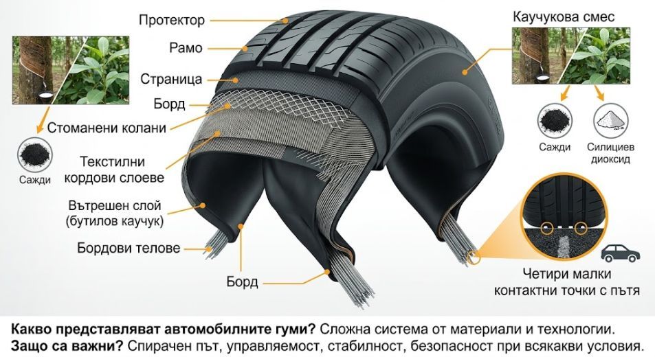 Много хора възприемат гумите като просто „каучук“, но реалността е много по-различна. В действителност те са високотехнологичен продукт, съставен от десетки компоненти.